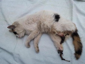 MALINKA to kilkuletnia koteczka, która trafiła pod naszą opiekę w wyniku podjętej przez nas interwencji na terenie jednej ze śląskich gmin. Właściwie to ocaliliśmy ją w ostatniej chwili. Ile cierpienia przeżyło to małe biedactwo możemy sobie tylko wyobrazić. Najprawdopodobniej jest ofiarą zakładania wnyków przez okrutnego kłusownika. Obcięte na różnych wysokościach…. łapki mogą świadczyć o tym, że musiała w te sidła wpaść, ma też obcięty kawałek ogonka. Tragedia musiała wydarzyć się kilka dni wcześniej. Umęczone i obolałe zwierzę przyczołgało się po pomoc na teren jednego z zakładów pracy . Portier opowiadał nam, że była bardzo spragniona i głodna. Końcówki łapek zgniły, w ranach muchy złożyły jaja, wylęgły się setki białych robaków. Dodatkowo jej ciało pokryte było opitymi krwią kleszczami. A jednak wola życia zwyciężyła. Zaraz pojechaliśmy z nią do lecznicy, gdzie udzielono jej pierwszej pomocy-nie potrafiliśmy zadecydować o tym, aby poddać ją eutanazji. Mimo tego okaleczenia, mimo setek kleszczy przeżyła i przywlokła się prosić ludzi o pomoc-nie mogliśmy nie dać jej szansy. Poprosiliśmy naszych zaprzyjaźnionych weterynarzy, aby zrobili wszystko, żeby ratować jej życie. Na początku istnienie Przystani mieliśmy kotka z obciętymi 3 łapkami- Mruczusia, który został przez nas uratowany, a potem adoptowany i żyje szczęśliwy do dzisiaj. Mieliśmy też sparaliżowane kotki-Elisię i Buffinkę które żyły szczęśliwie w Przystani- lubiły wygrzewać się w ogródku, nawet łowiły myszy. Pomagał im w życiu wózeczek. Dlaczego i tej biednej kotce nie mieliśmy dać możliwości dalszego życia?