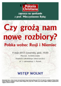 Temat spotkania brzmi: „Czy grożą nam nowe rozbiory? Polska wobec Rosji i Niemiec”