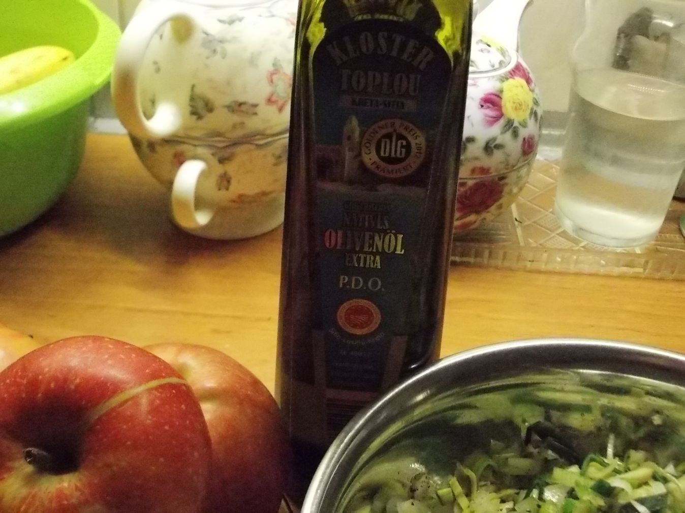 Duża ilość oliwy z oliwek bardzo pozytywnie wpływa na nasz organizm. Oliwa potrzebna jest do lepszego przyswajania witamin. Dlatego taka kompilacja, jabłka, marchwi pory z oliwą, jest bardzo pożyteczna.