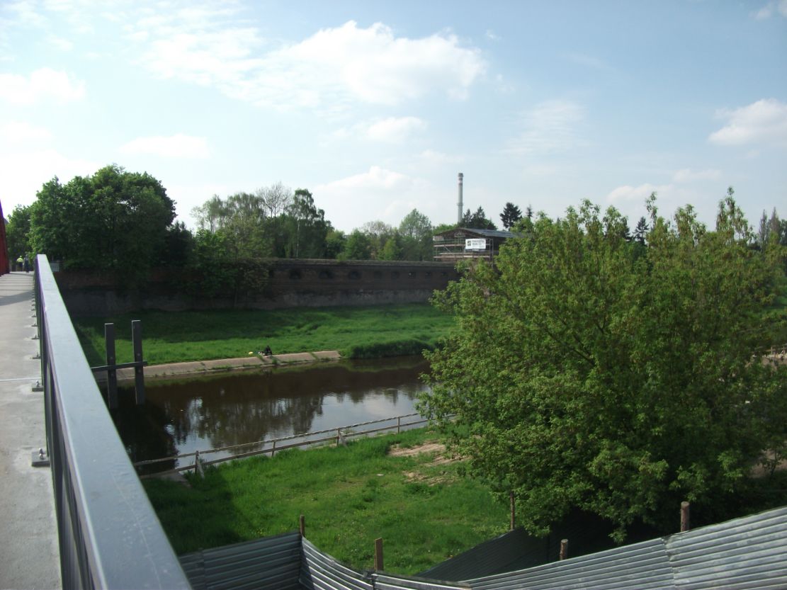 Poniżej zdjęcia tego dziwnego kompleksu moim zdaniem (i nie tylko moim) zupełnie nie pasującego do tamtego miejsca. Po drugiej stronie Cybiny, na Ostrowie Tumskim widać zupełnie innym stylem budowane resztki umocnień miejskich. Projektant zupełnie nie przejmował się brakiem konsekwencji architektonicznej do tamtych budowli i wymyślił betonowy sześcian…