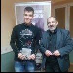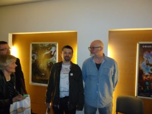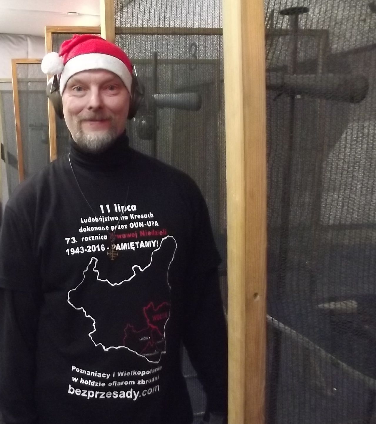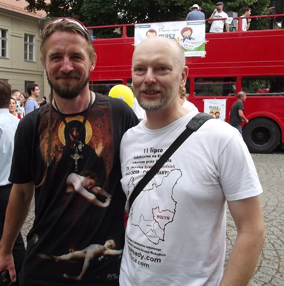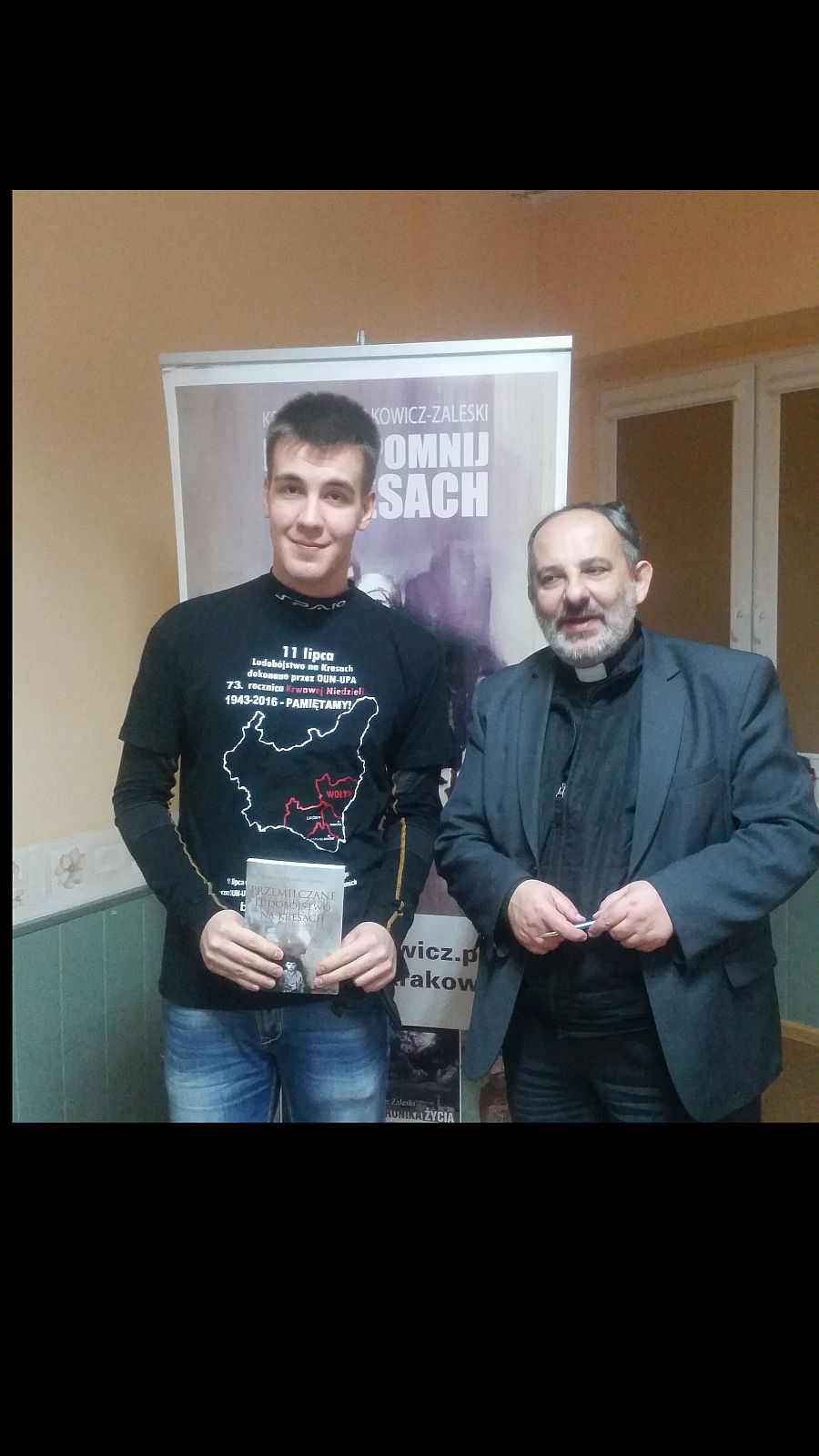Jarek w koszulce na spotkaniu z reżyserem „Wołynia”.