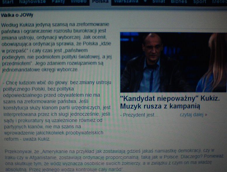 Przykład najświeższego materiału w którym w mainstreamie donosi się o uzyskaniu 100 tys podpisów, ale jednocześnie przypomina się materiał starszy z symptomatycznym tytułem sugerującym brak powagi u Pawła Kukiza jako kandydata na prezydenta. Jedyny NASZ kandydat, jedyny niezależny i jedyny który mówi prawdę w oczy.
