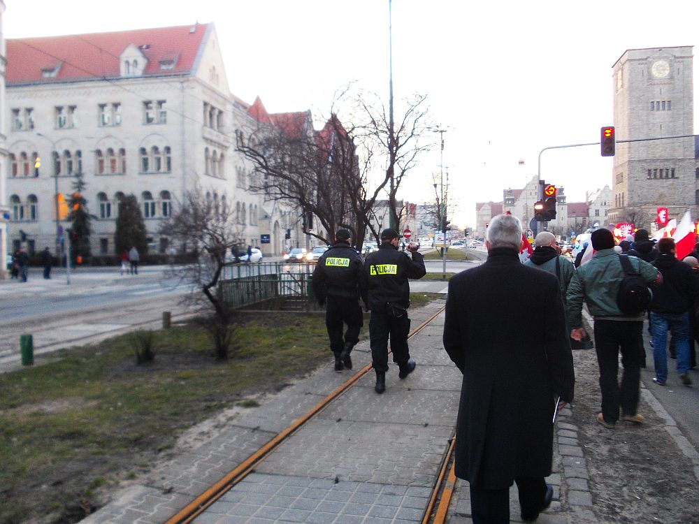 Policja bardzo szczegółowo fotografowała i filmowała uczestników marszu. Nie zauważyłem takich działań w przypadku lewackiego marszu równości w zeszłym roku w listopadzie ( Pancerny marsz równości ? gotowość bojowa najwyższego stopnia? ? zdjęcia. ). Dostrzegłem też że tamten marsz był OCHRANIANY przez policję. W przypadku marszu ku czci polskich bohaterów, którzy zginęli w walce z komunistyczna agresją (wielu było policjantami przedwojennymi) nie można było odebrać w taki sposób asysty policji.