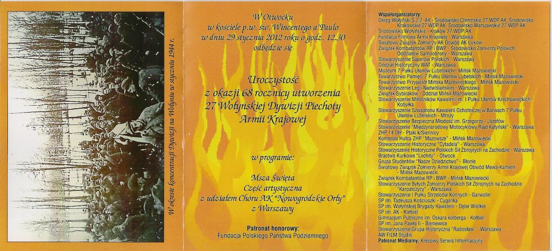 Wczoraj w Otwocku trzeci raz odprawiono uroczystą, rocznicową mszę za członków 27 dywizji, połączoną z obchodami jej powstania. Mówiono o Ludobójstwie dokonanym przez OUN-UPA. Wśród gości honorowych znaleźli się między innymi; Ewa Siemaszko, żołnierz 27 WDPAK Andrzej Żupański, Prezes FPPP Anna Lewak i wielu innych. Na mszy obecnych było 17 pocztów sztandarowych.