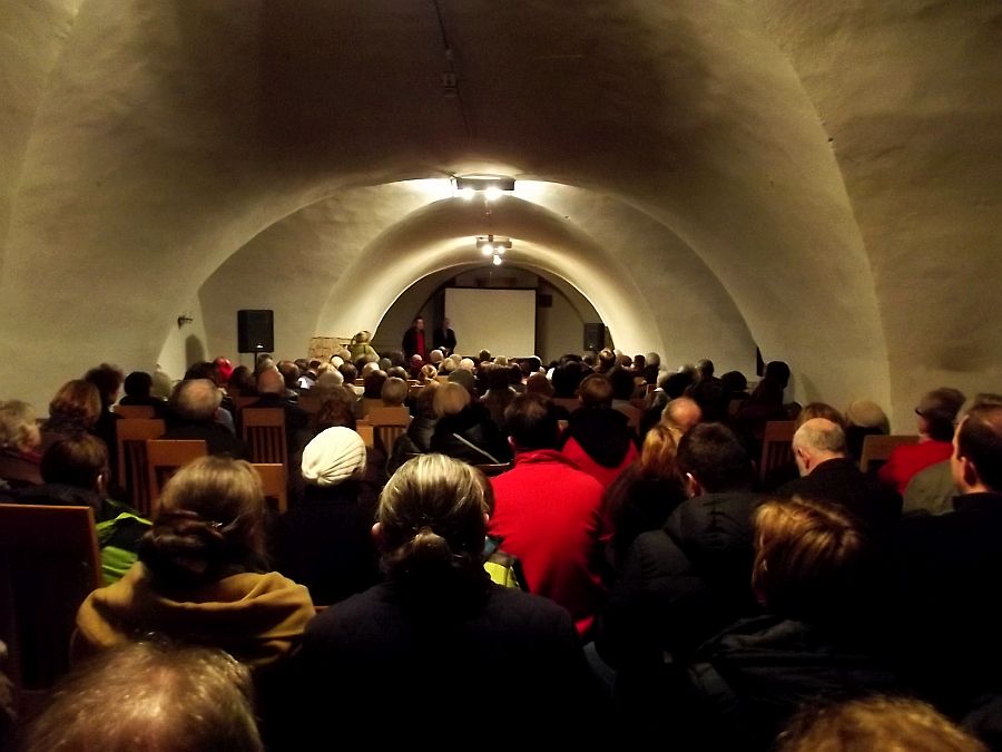 Wcześniej pokaz filmu. Sala podziemna w Kinie Duchowym u karmelitów (na Wzgórzu Św. Wojciecha) pękała w „szwach” jak to się mówi.