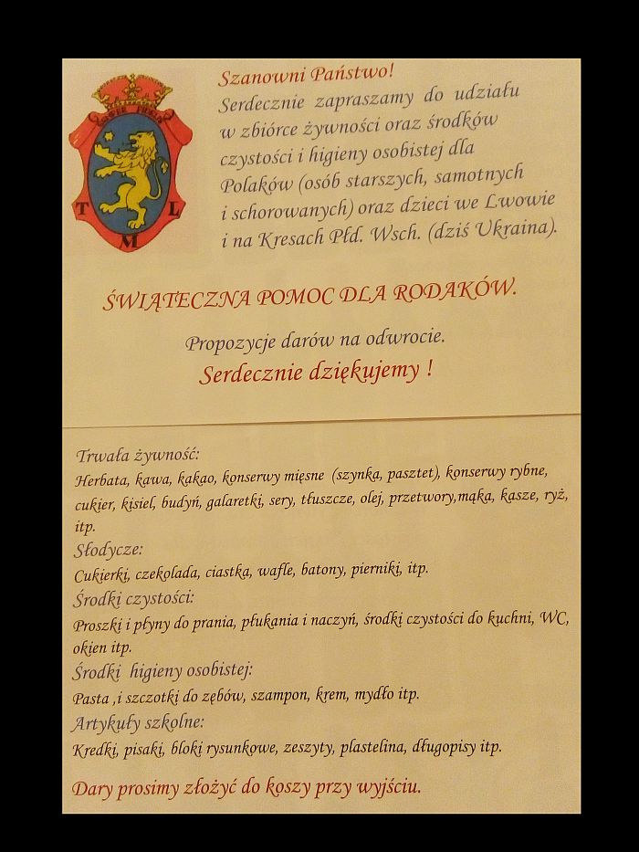 Zbiórka darów dla Polaków na Kresach, współpracują młodzi ludzie, zbierają w marketach. Jak rozmawiałem z jednym z członków TML-u jest to tak naprawdę pomoc symboliczna, która głownie ma na celu wskazanie na więź z Ojczyzną. Dociera też do trzech parafii, między innymi parafii w Przemyślanach. Włączył się Caritas poznański przekazując 1000 zł.