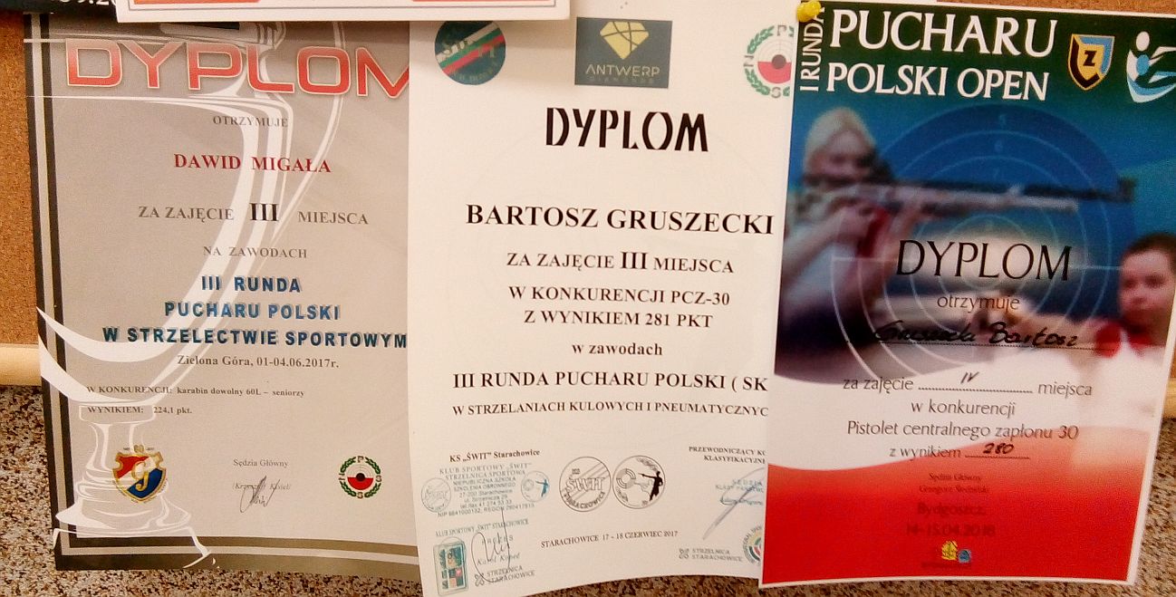 Dyplomy dla zawodników WKS Grunwald wiszące w klubie jako trofea: