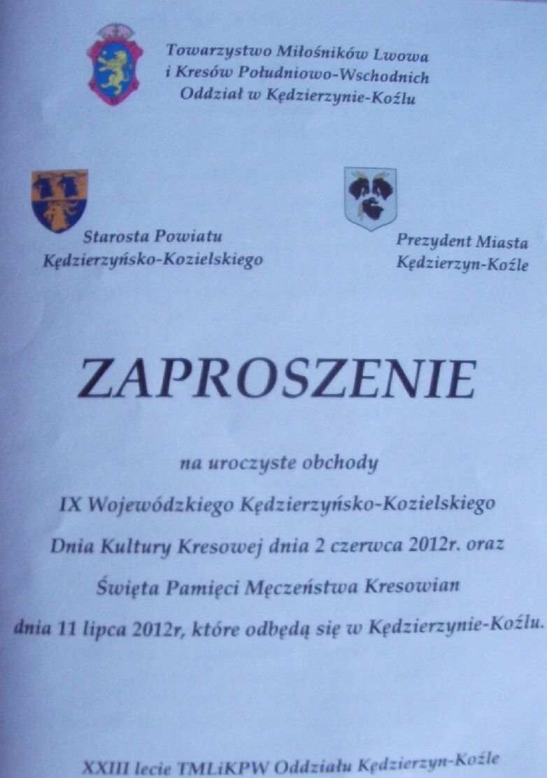 Od Prezesa TMLiKPW Pana Witolda Listowskiego otrzymałem zaproszenie na dni Kultury Kresowej, które będą odbywały się w Kędzierzynie Koźle w dniach: 2 i 3 czerwca. Wszystkich, którzy mogą tam dojechać zapraszam razem z nim… A tych którzy nie mogą – proszę zaglądać na stronę, robię co tylko można, aby dni Kultury Kresowej i wiedzy o Kresach Wschodnich, trwały 365 dni w roku…