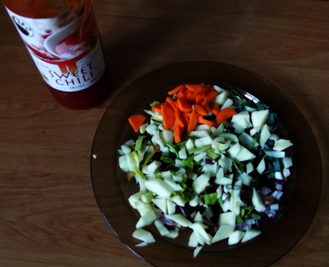 Nakładamy zawartość patelni na wcześniej przygotowane posiekane i wyłożone na talerz następujące składniki: jabłko, por, marchewkę (połowę), cebulki, orzech włoski: