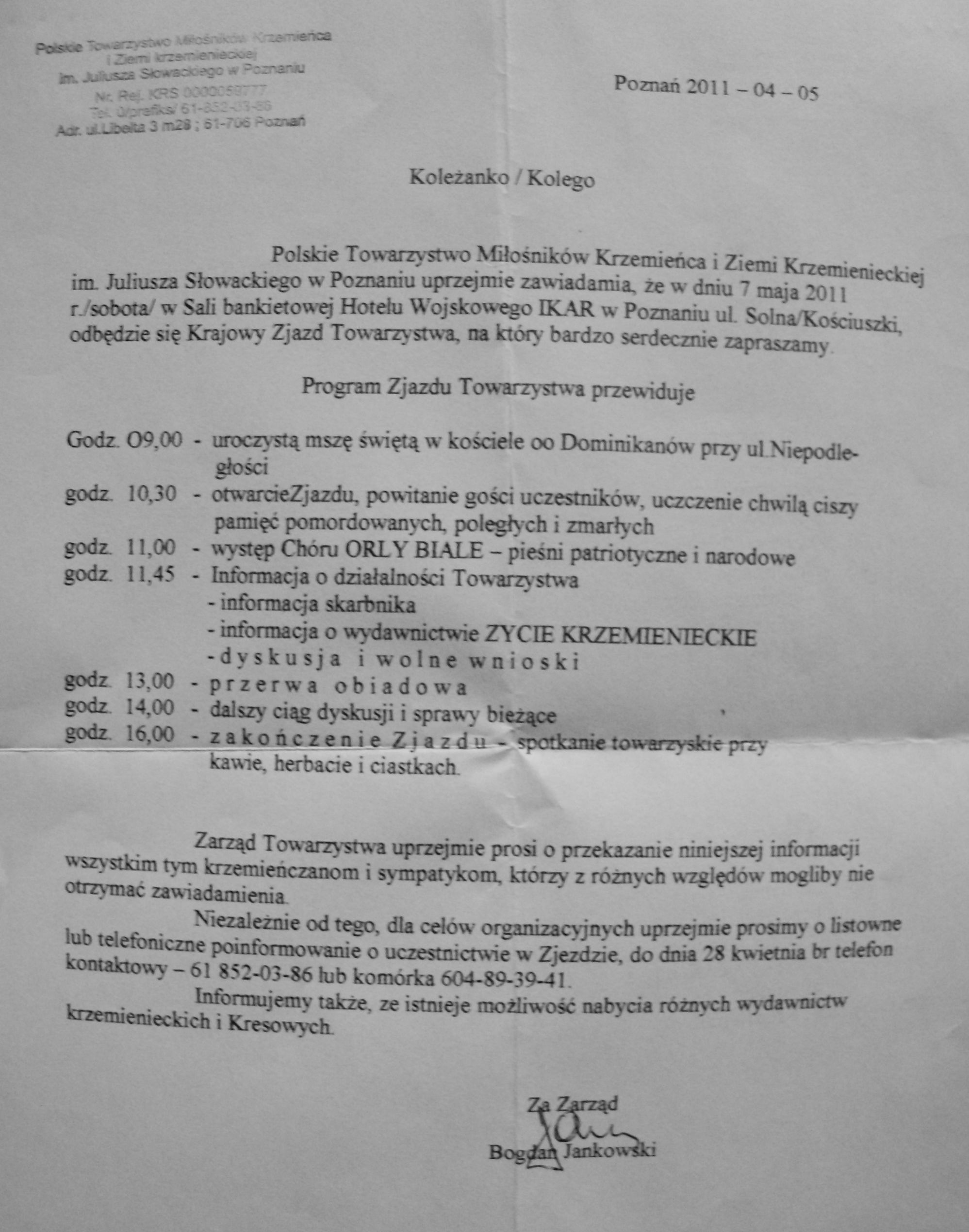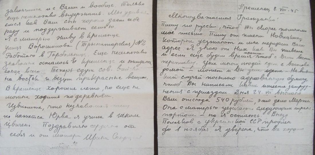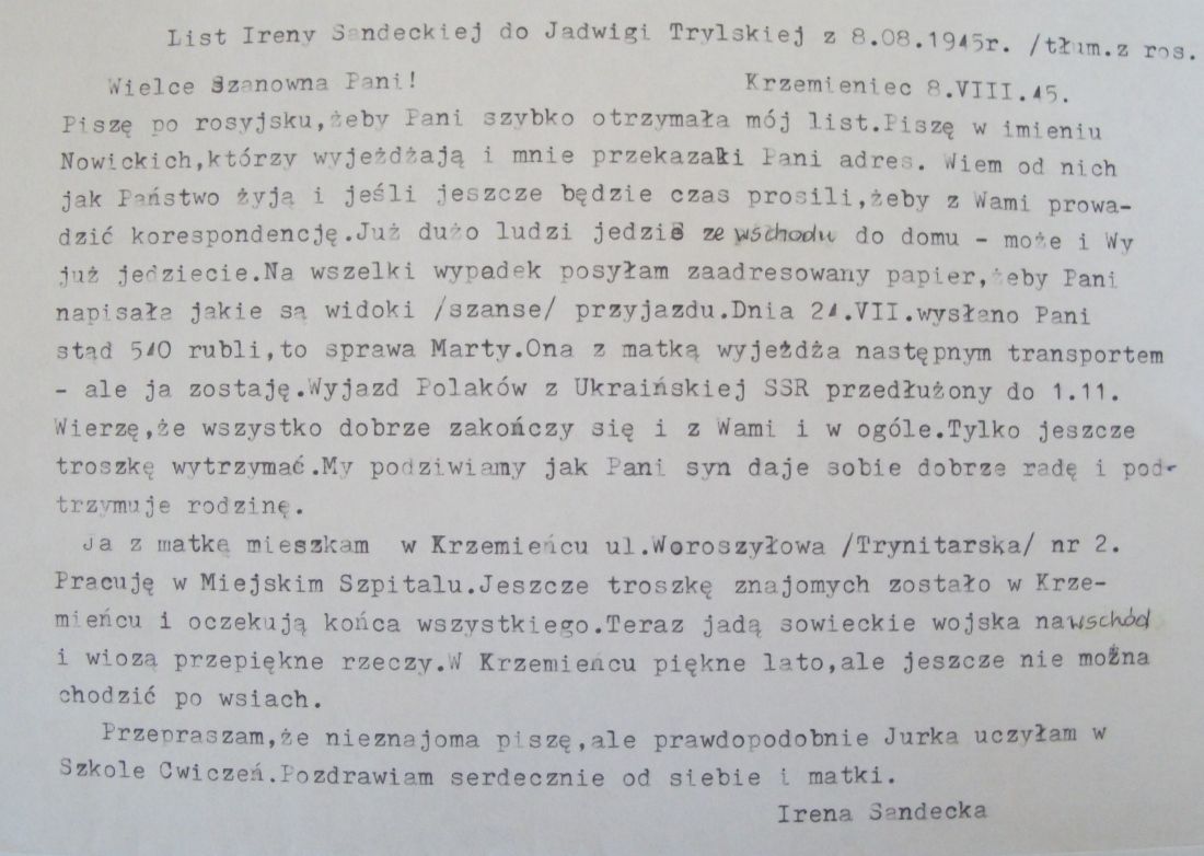 Kilkanaście osób zebrało się w Poznaniu aby wspomnieć te czasy. Przeczytano skrzętnie przechowywany list wysyłany w 1945 roku do Kazachstanu, list pisany ręką Pani Ireny Sandeckiej. Osoby znanej w całym Krzemieńcu i poza nim. Nauczycielki w liceum krzemienieckim, twórczyni elementarza do nauki języka polskiego. Wielkiej patriotki i miłośniczki kotów. Od zeszłego roku nie ma jej już wśród nas. Został jej domek przepisany Wspólnocie Polskiej, smutne koty, które już teraz rozpierzchły się po zakątkach miasta, nie mogąc doczekać się swojej Pani na progu domku…