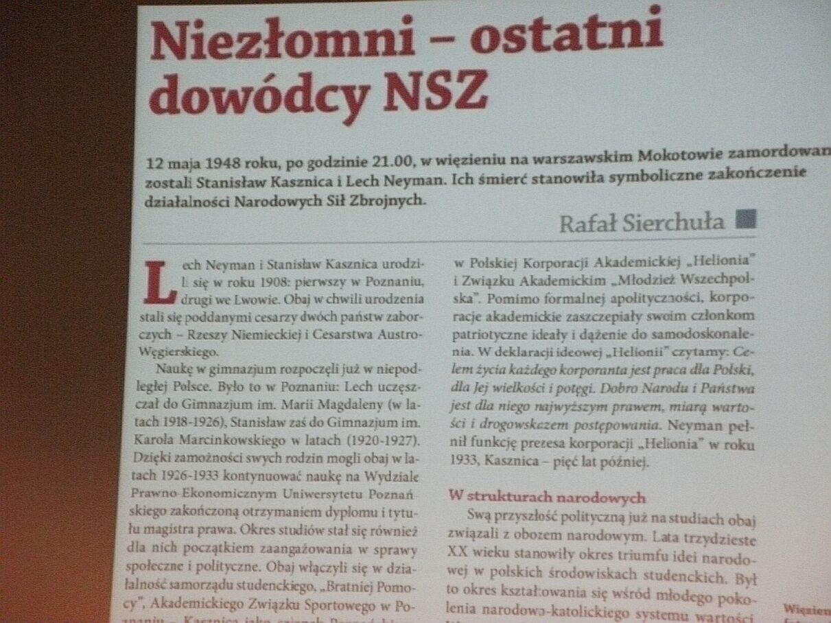 W zeszłym roku odbył się zjazd z okazji 20 lecia związku żołnierzy NSZ. Tych, którzy jeszcze żyją. Przyjechali też i sympatycy, rodziny zmarłych, oczywiście historycy. Zjazd odbył się w legendarnym budynku PASTY w Warszawie gdzie mieści się FPPP i ŚZŻAK. Było wielu gości. Między innymi odbył się pokaz materiałów filmowych dotyczących realizacji filmu o „Roju” jednym z tych którzy walczyli aż do śmierci przeciw systemowi siłą wprowadzanemu na terenie Rzeczpospolitej. Walczyli z komunistami. Za to po latach w III Rzeczpospolitej nadal skazano ich na zapomnienie. Są jednak ludzie, którzy walczą o tą pamięć. Należy sobie zadać pytanie: dlaczego każe się nam zapominać? Dlaczego tak ciężko postawić jeden czy drugi pomnik, czy zawiesić tablicę pamiątkową? Ich nieprzejednanie, fakt że nie złamali się do końca? Opcja którą reprezentowali, nadal zbyt niewygodna, zbyt patriotyczna, zbyt nie na czasie. W Europie gdzie mają zatracić się wszelkie różnice kulturowe i mentalne, w Europie nijakości i ogólnej pochwały „Carpe Diem”. Gdzie naród z historia, z bohaterami jest niemile widziany. Może to klucz? Wyciąga się takie wydarzenia jak Jedwabne, kłamie oczernia, manipuluje, po cichu przyzwala się na slogany w stylu „polskie obozy koncentracyjne”, aby zabić coś w narodzie, który najwięcej stracił w czasie minionej wojny, a najbardziej został poniżony, opluty i wykorzystany.