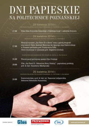 W przededniu uroczystości kanonizacyjnych Ojca Świętego, Jana Pawła II społeczność akademicka Politechniki Poznańskiej wraz z pracownikami poznańskich szkół wyższych, pragnie uczcić to niezwykle podniosłe wydarzenie organizując na naszej uczelni Dni Papieskie.
